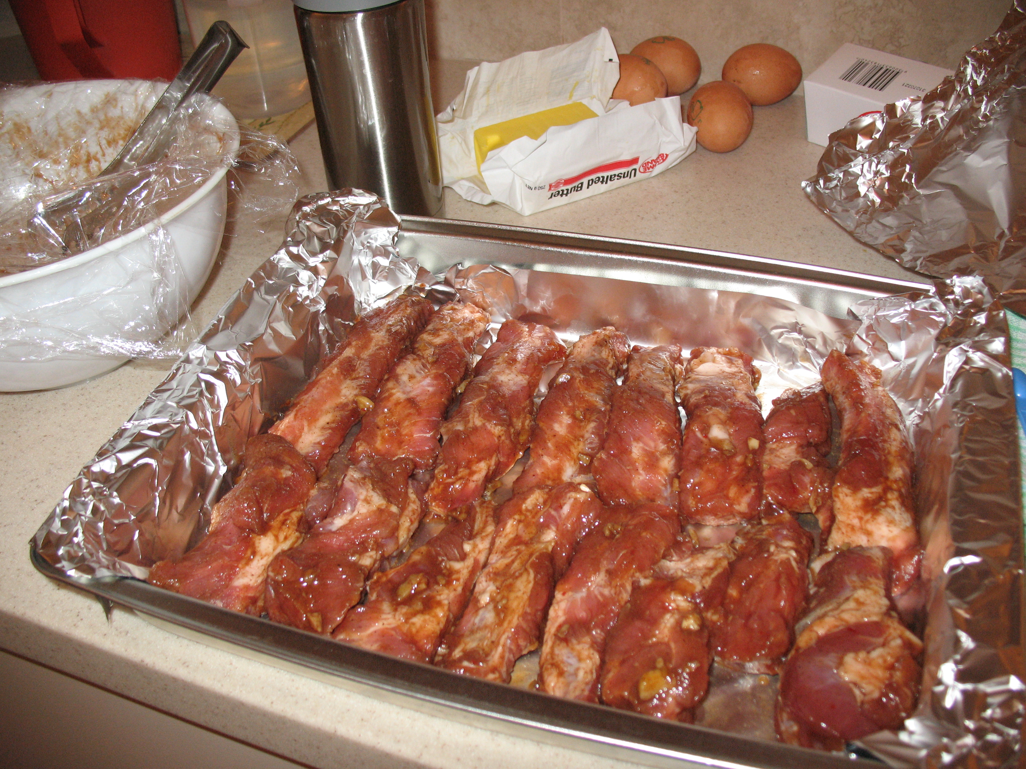 Cover with clingfilm and leave to marinate overnight in the refrigerator,occasionally spooning the marinade over the ribs. When ready to cook, remove the ribs from the marinade and place in a shallow roasting pan.