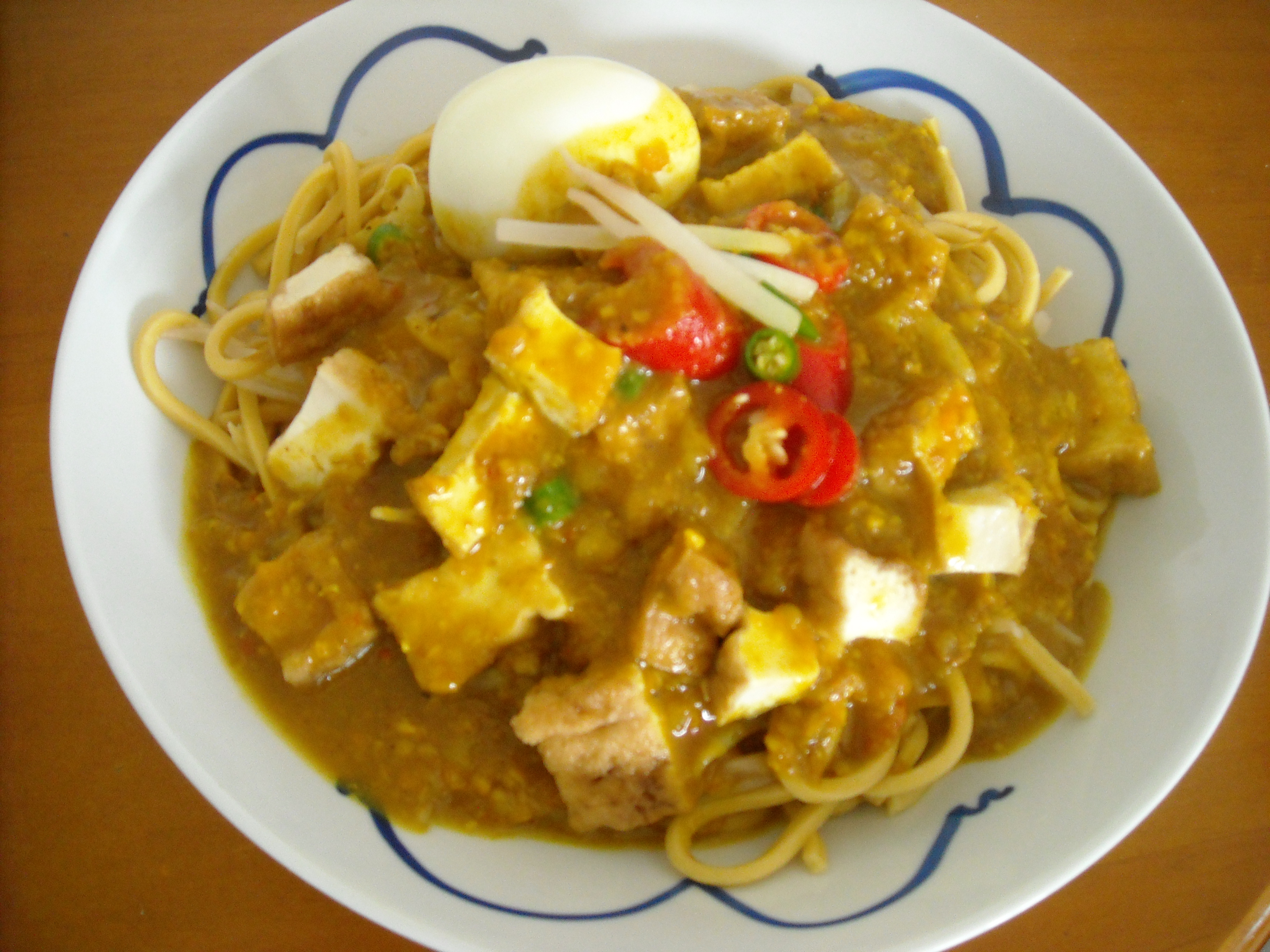 It is a noodle dish popular in Malaysia,Indonesia and Singagpore. It is made up of yellow noodle and slightly spicy but thick sweet potato base gravy. It mainly comes with bean sprouts,boiled eggs, firm tofu and some green chilli. Enjoy la!