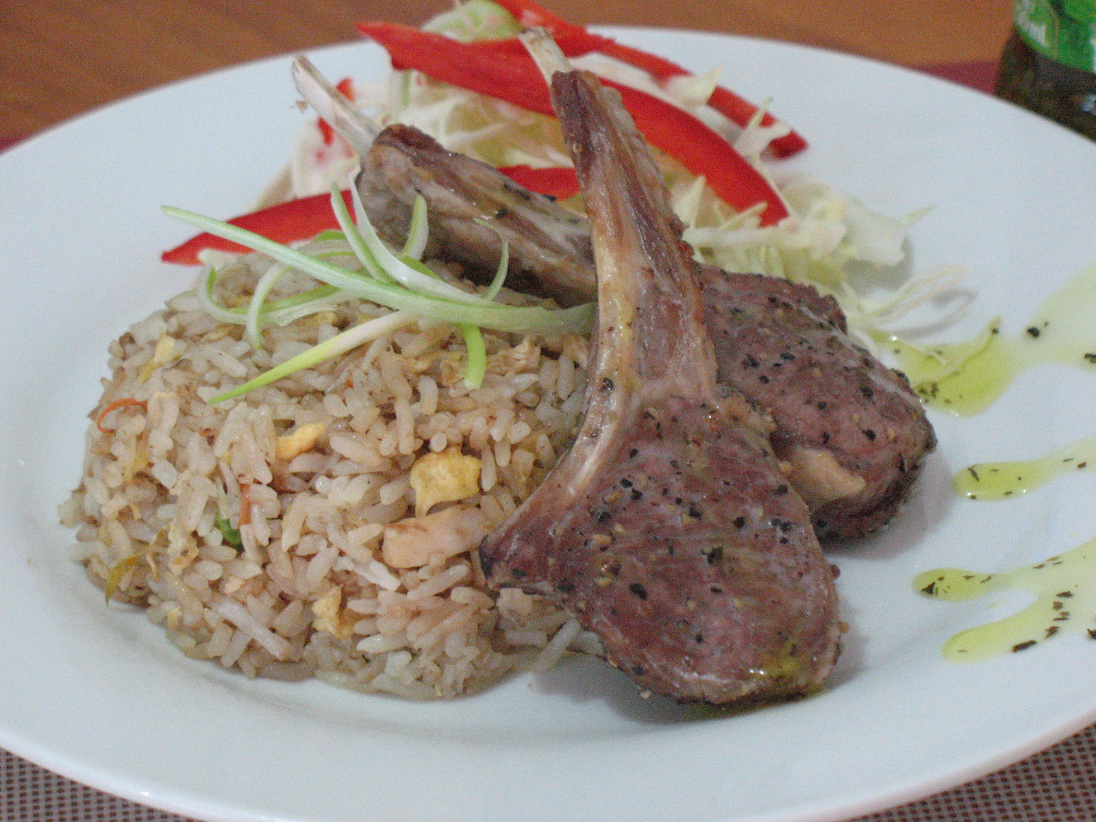 I gave myself a dinner treat today cooking french cutlets accompaniments fried rice and some fresh shredded cabbage and red capsicum with mint sauce.