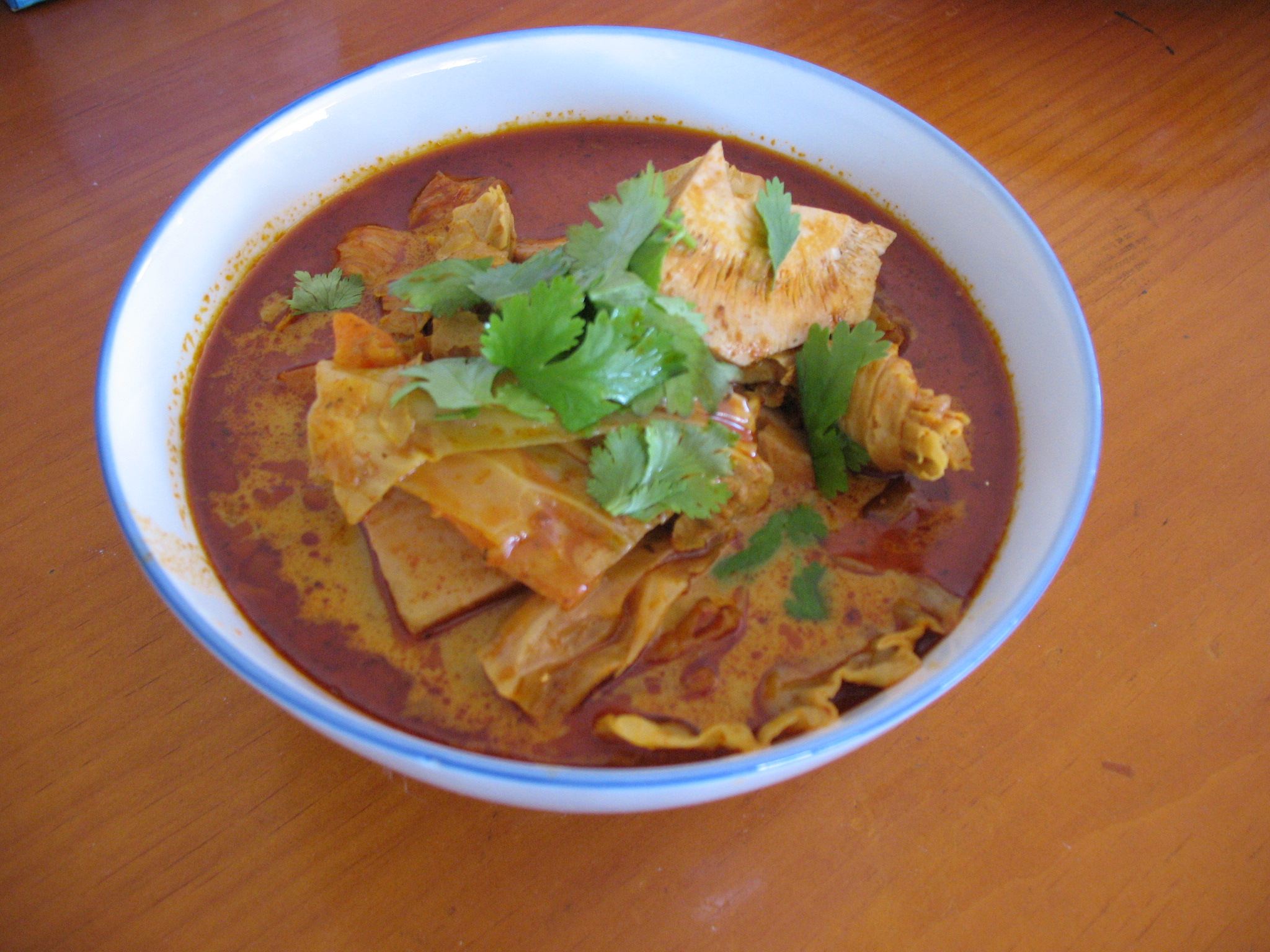 - Heat up 3 tbsp oil in hot wok. Shallow fry the curry paste till chilli oil is separated and fragrant. Add in all the vegetables, glass noodle, beancurd sticks and jackfruit and fry gently till all combined.