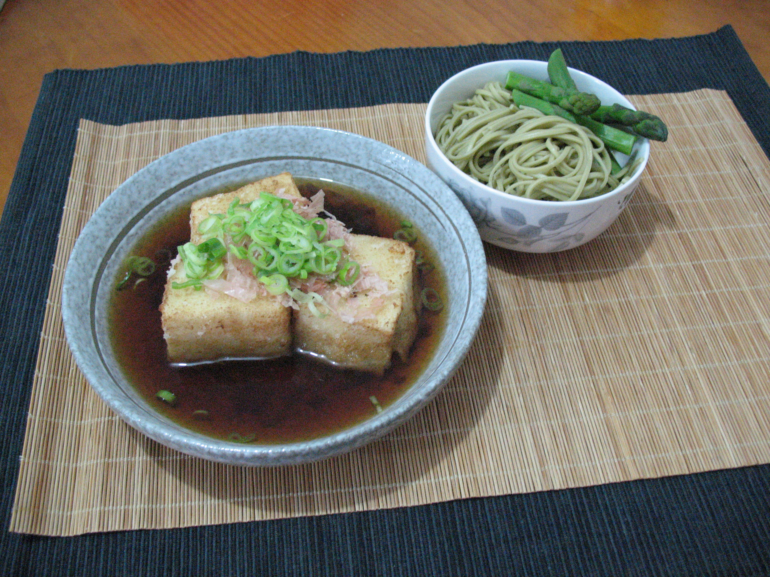 Cold Soba is called Zaru Soba. Soba is Japanese noodles made from buckwheat flour. Cold soba(chilled) is served with a dipping sauce or as a noodle soup in a hot broth. I cooked two recipes today. One is the Zaru soba and accompanied by crispy tofu soaked in bonito sauce.