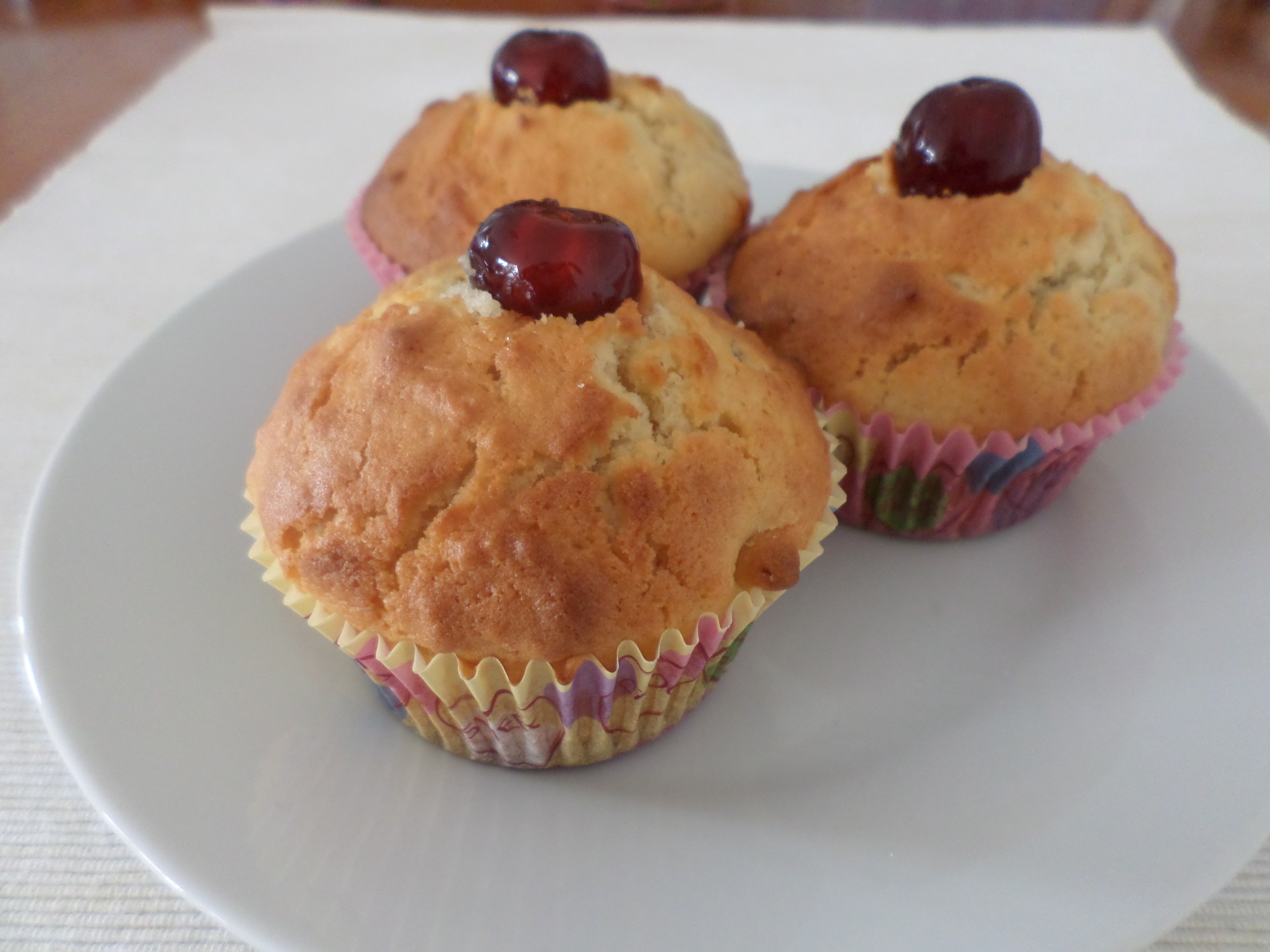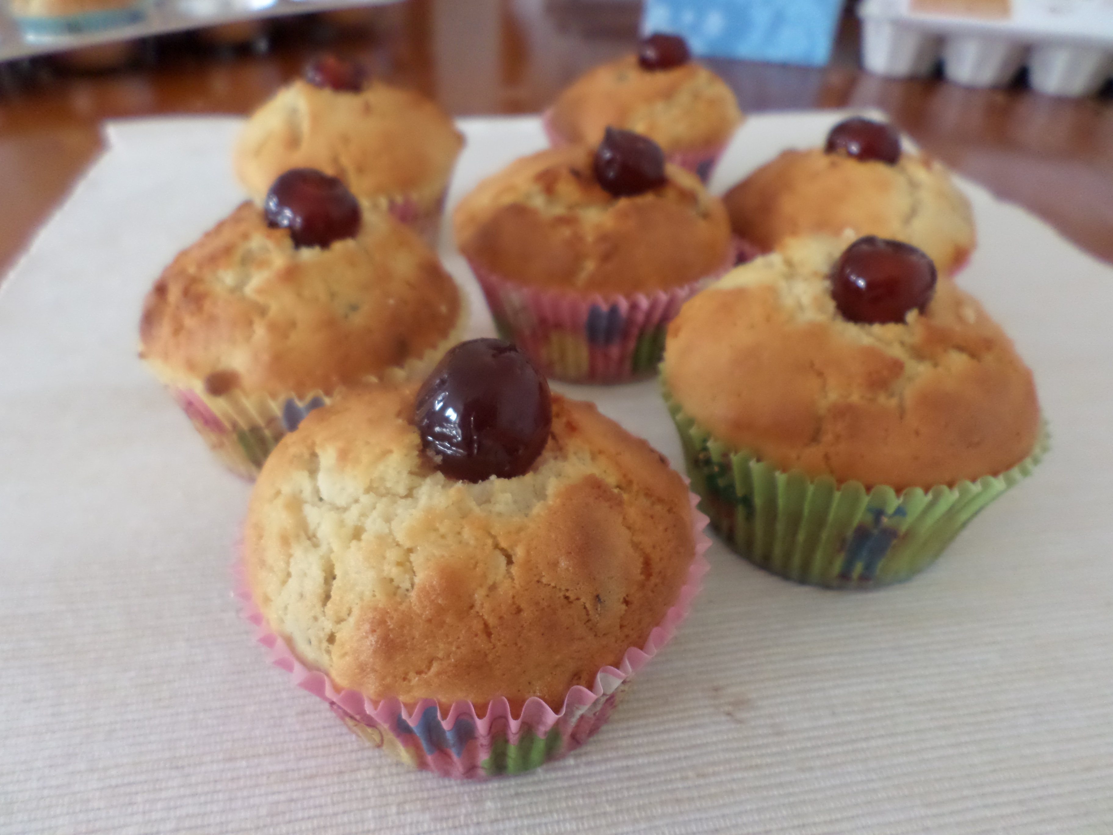 - Spoon the mixture into the prepared muffin tin. Top each muffin with a whole fresh cherry. Bake in the preheated oven for about 20 minutes, until well risen, golden brown and firm to the touch.