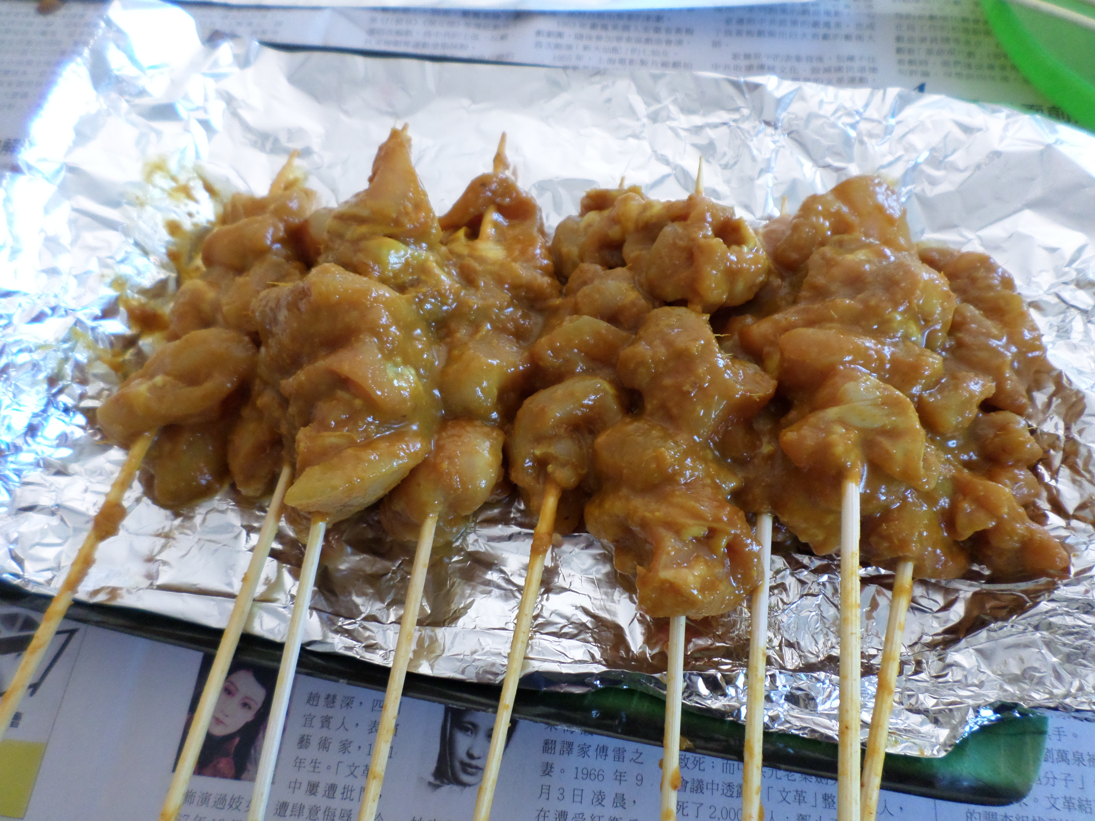 All I did was prepared some chicken thigh and cut into some bite size pieces and marinate with the satay sauce preferably overnight. Thread the chicken strips onto the satay sticks(skewers) and popped them onto the oven and grill until done. (making sure you soak the satay sticks in some water for at least 30 minutes before use to avoid burning)