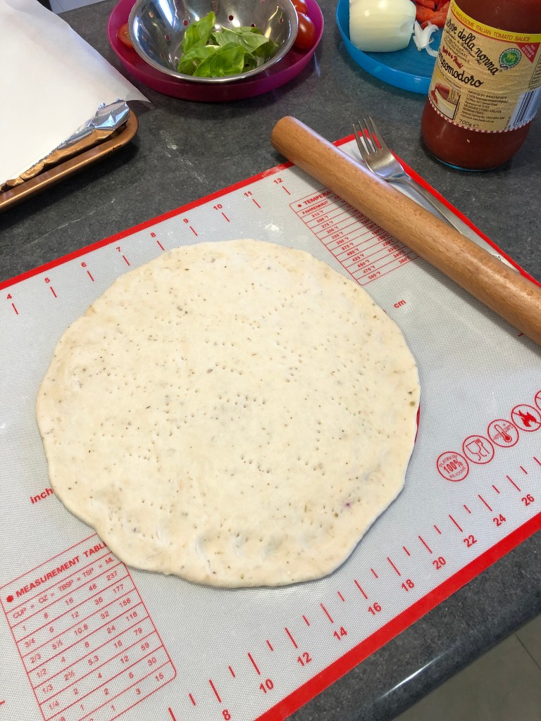 Now make the base by pressing down the dough and roll it out flat with a rolling pin to desire size and thickness.