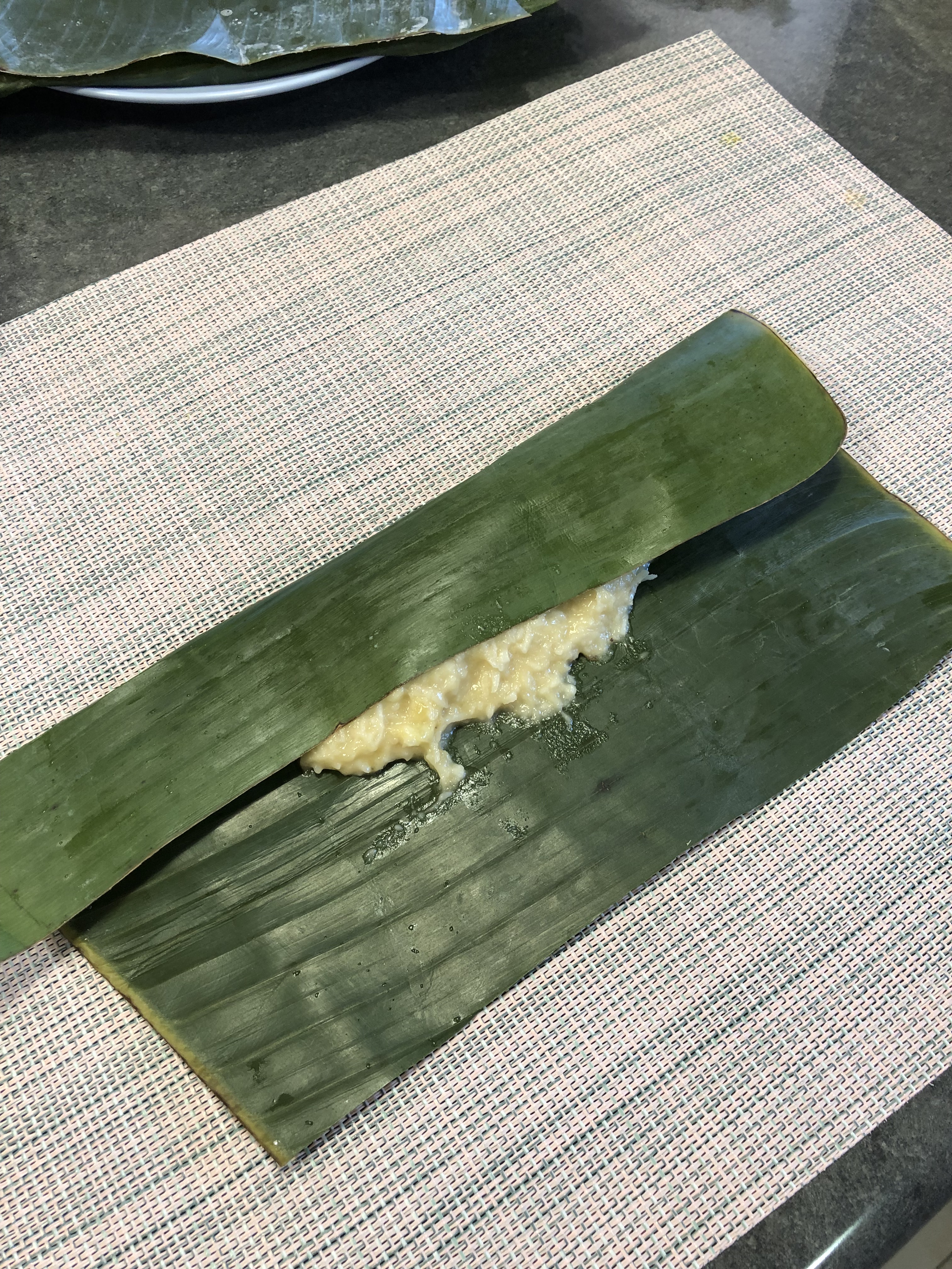 Wrap the banana leaf by folding the top layers and tucking at both ends.